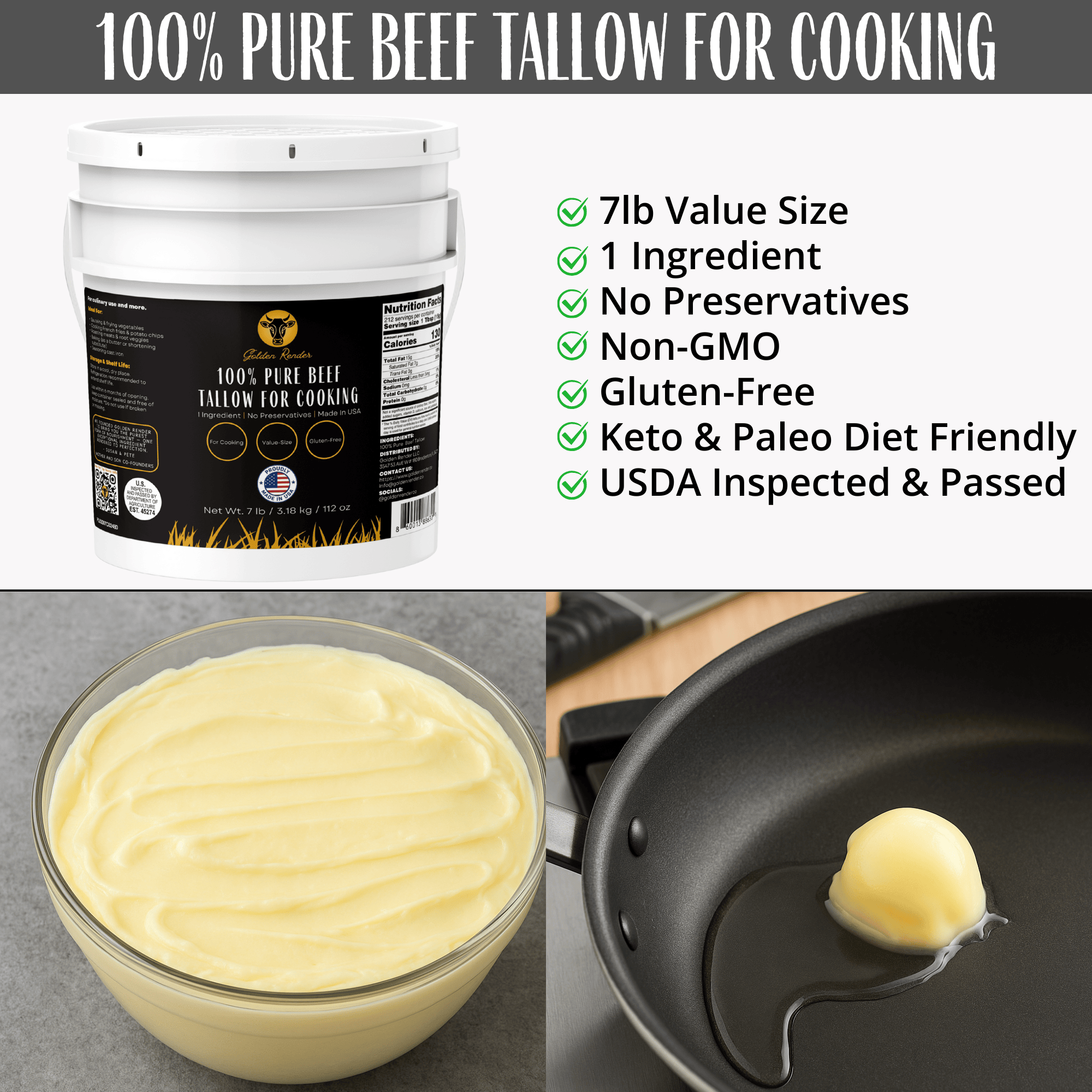USDA Inspected & Passed - Officially inspected and approved by the U.S. Department of Agriculture. Beware of many other tallows that do not have this badge on their label. Who knows what you're getting...Golden Render is proudly rendered and packaged in America for trusted quality and freshness.